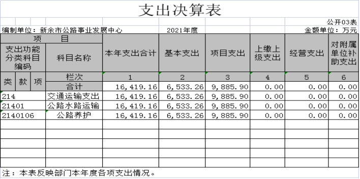 本部門2021年度支出總計16419.16萬元,與收入持平,較2020年50491.92萬元減少34072.76萬元,下降67.48%,主要原因是公路改建項目資金減少。