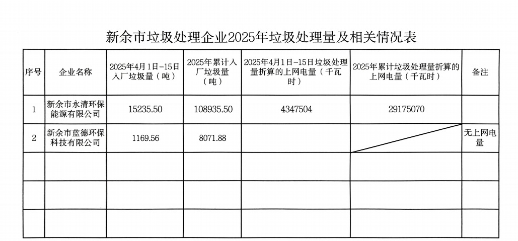 新余市垃圾處理企業2025年垃圾處理量及相關情況表(2025.4.1—2025.4.15)