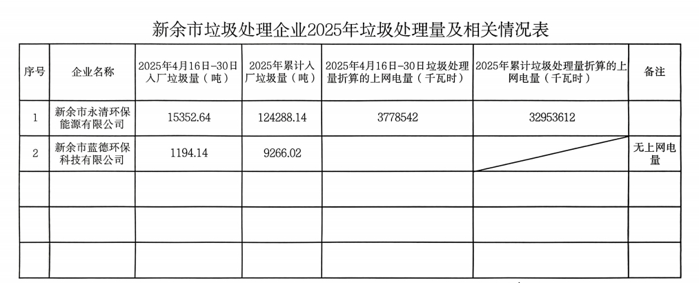 新余市垃圾處理企業(yè)2025年垃圾處理量及相關(guān)情況表(2025.4.16—2025.4.30)