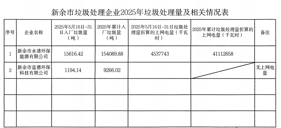 新余市垃圾處理企業2025年垃圾處理量及相關情況表(2025.5.16—2025.5.31)