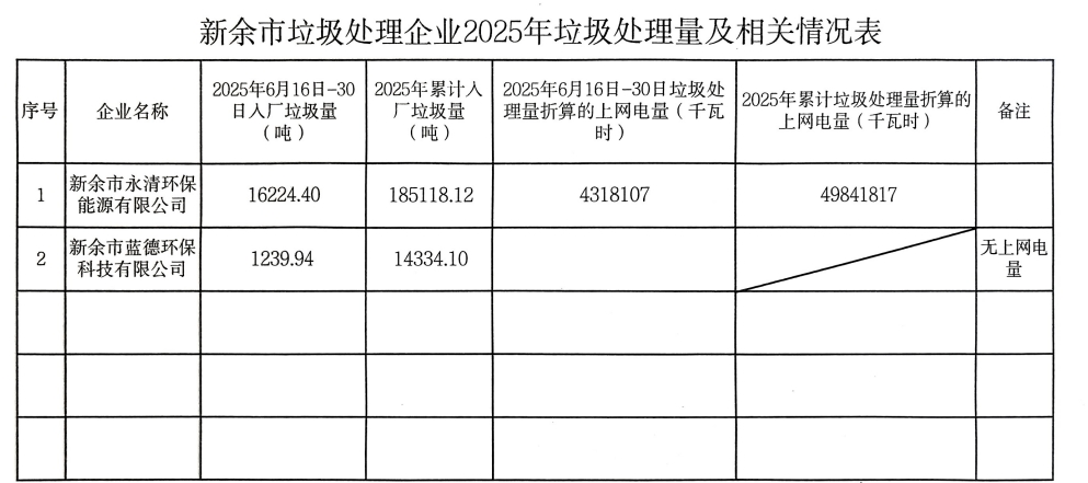 新余市垃圾處理企業2025年垃圾處理量及相關情況表(2025.6.16—2025.6.30)