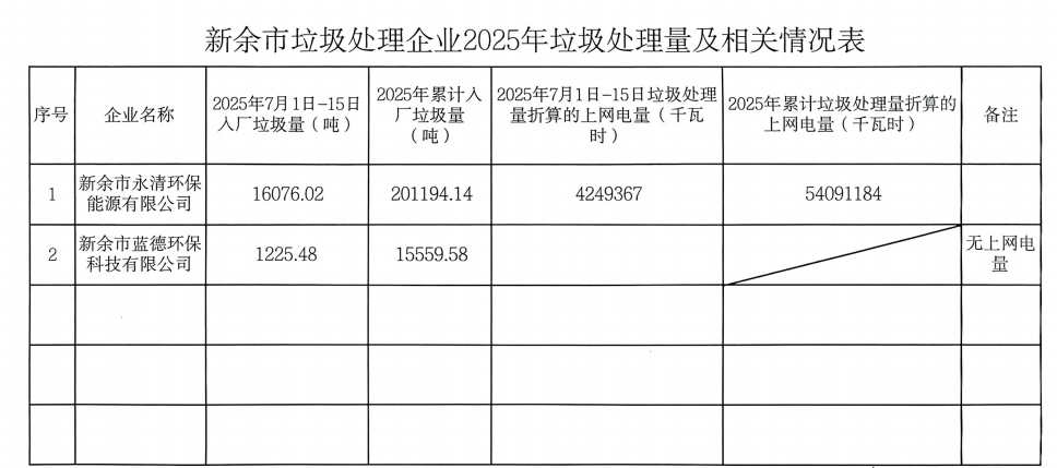 新余市垃圾處理企業2025年垃圾處理量及相關情況表(2025.7.1—2025.7.15)