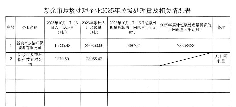 新余市垃圾處理企業2025年垃圾處理量及相關情況表(2025.10.1-2025.10.15)