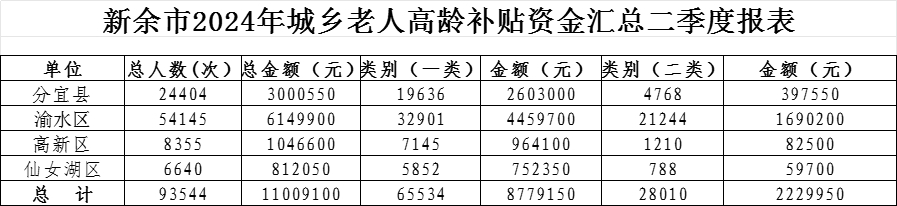 【高齡補貼】新余市2024年城鄉老人高齡補貼資金匯總二季度報表