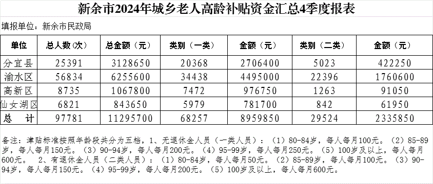 【高齡補貼】新余市2024年城鄉老人高齡補貼資金匯總4季度報表