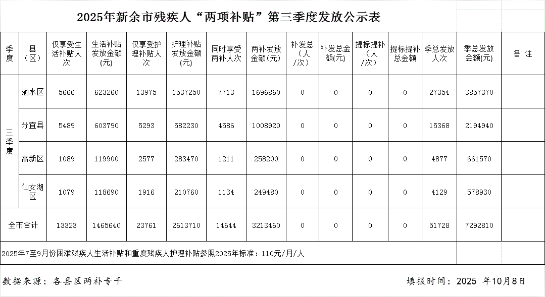 2025年新余市殘疾人“兩項補貼”第三季度發(fā)放公示表