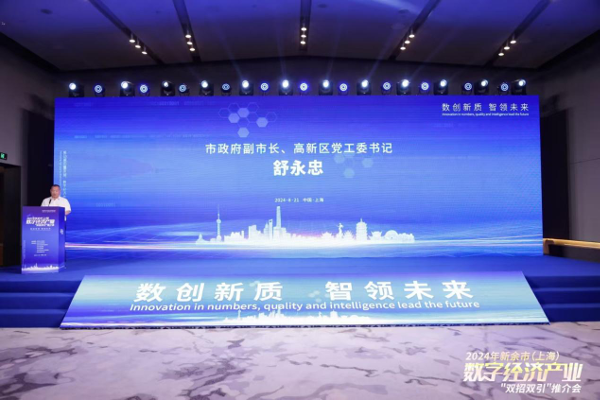 數創新質,智領未來。8月21日,新余市(上海)數字經濟產業“雙招雙引”推介會在上海隆重舉行。市政府副市長、高新區黨工委書記舒永忠出席并致辭,市政府副市長、高鐵新區黨工委書記賀利華及市數據局黨組書記雷蕾的數字人“小蕾”共同主持,市高鐵新區黨工委副書記、管委會主任陶從知作招商推介。上海等地的知名企業、商會、各界人士等120余名客商參加推介會。