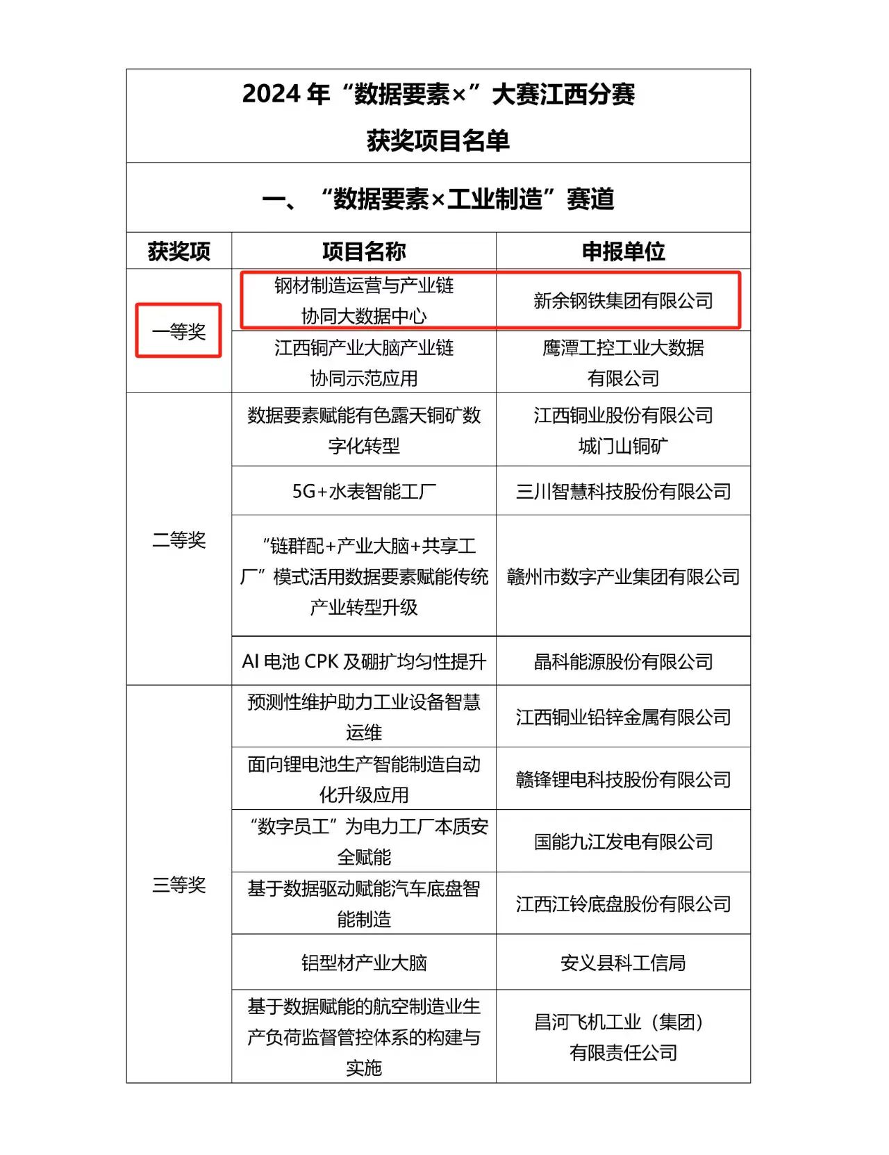 近日,由國家數據局、江西省人民政府指導,江西省發改委(江西省數據局)聯合16個省直部門主辦的2024年“數據要素×”大賽江西分賽決賽落下帷幕,最終我市7支入圍團隊5支獲評前三。其中,我市新鋼公司鋼材制造運營與產業鏈協同大數據中心項目以第一名的成績,斬獲本次大賽工業制造賽道全省一等獎,將代表江西省參加全國總決賽。