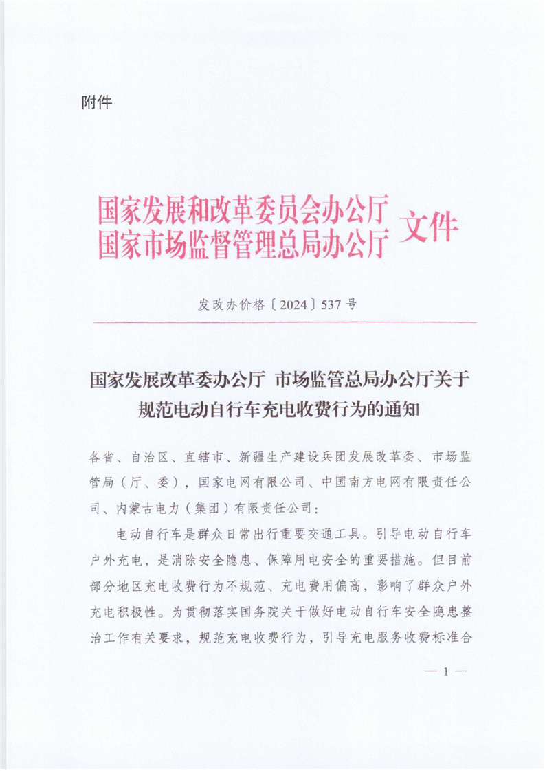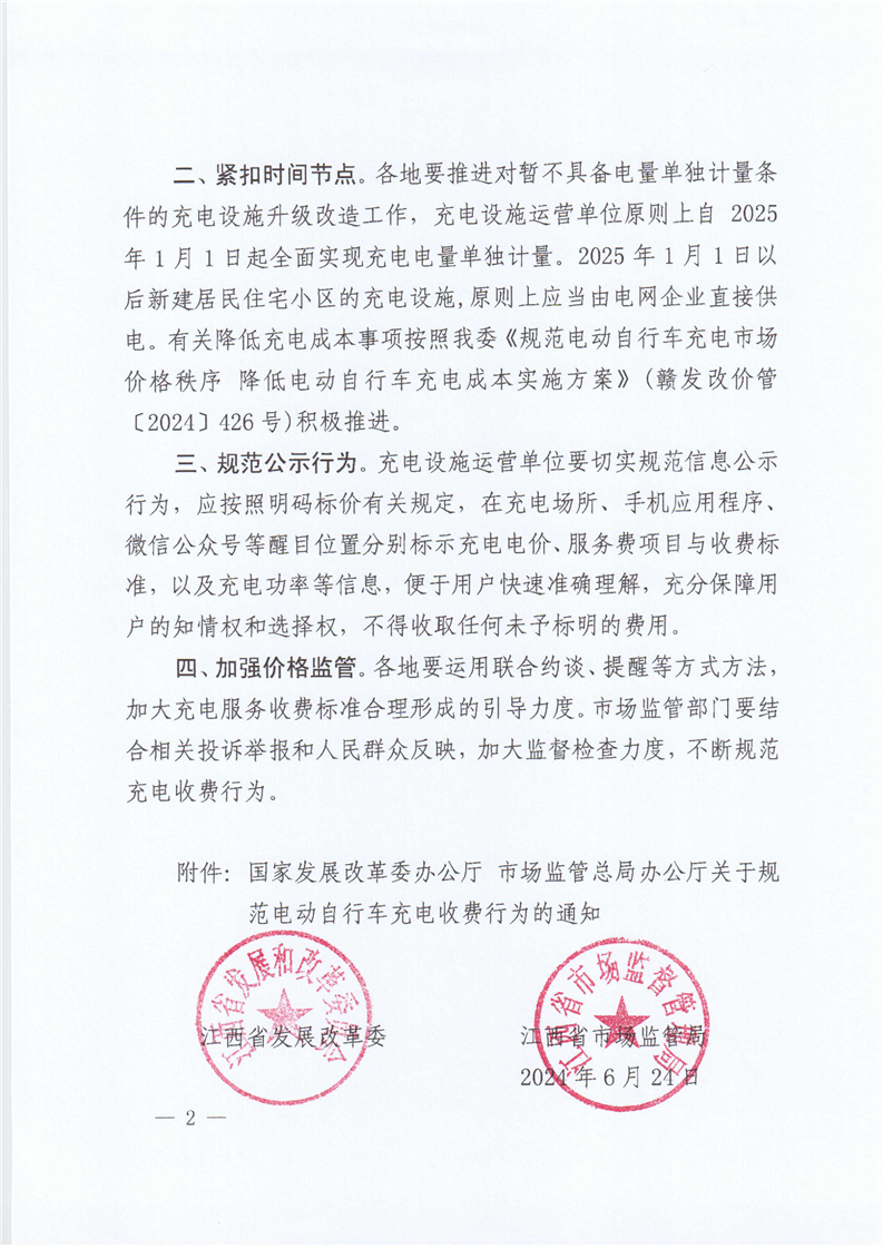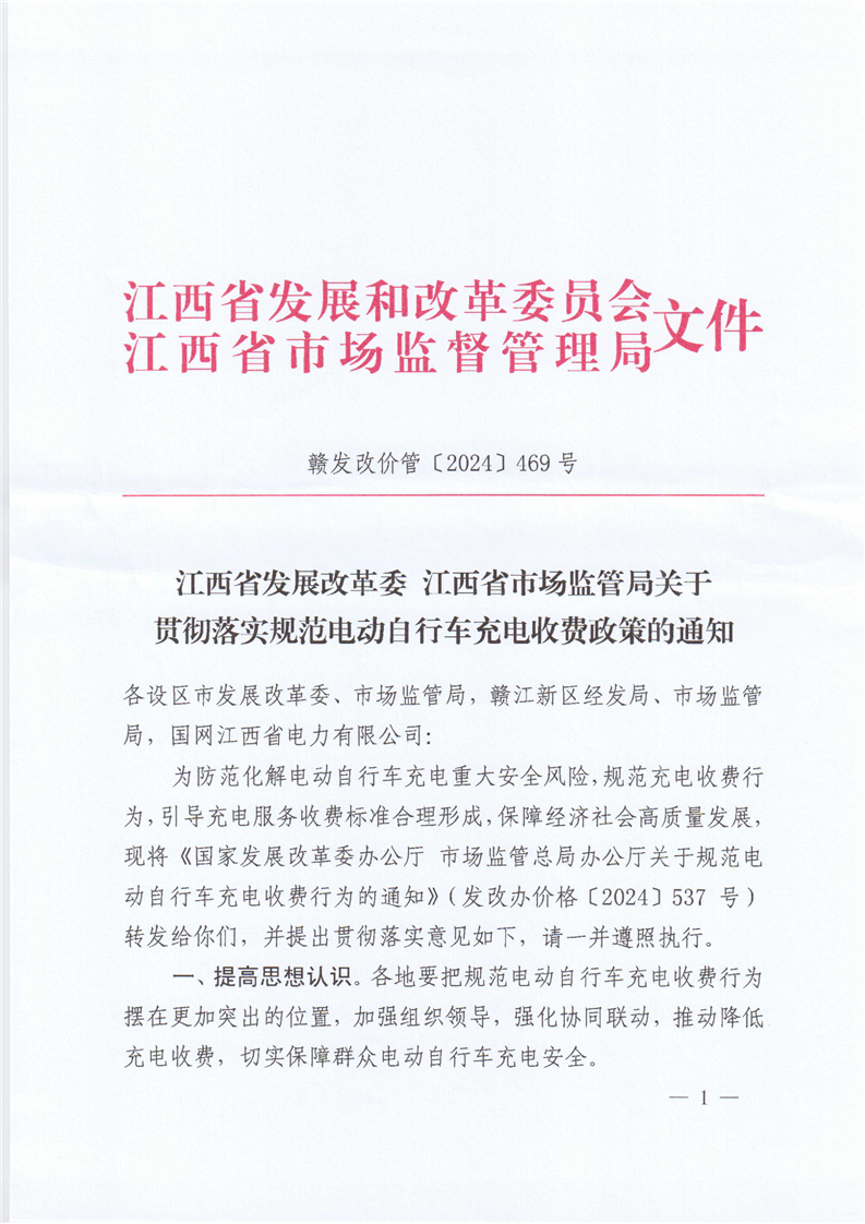 江西省發(fā)展改革委江西省市場監(jiān)管局關(guān)于貫徹落實(shí)規(guī)范電動(dòng)自行車充電收費(fèi)政策的通知(贛發(fā)改價(jià)管〔2024〕469號)