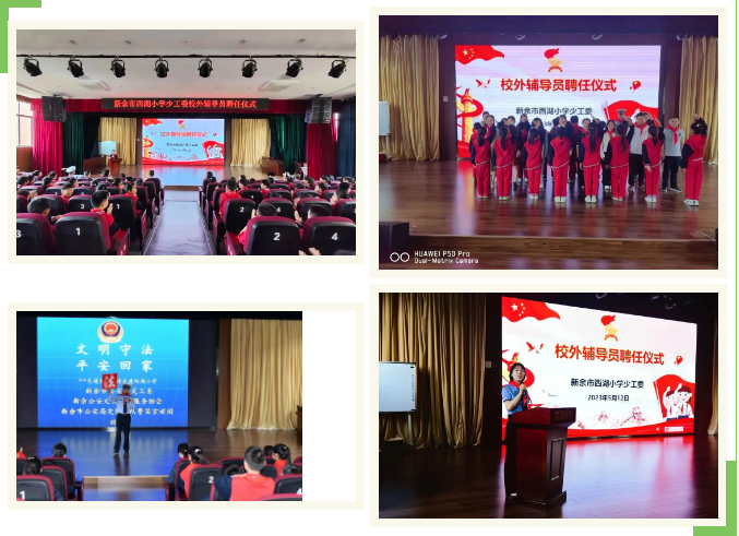 為充分發揮校外輔導員作用,進一步優化少先隊陣地建設,推動少先隊工作發展,5月12日下午,市西湖小學少工委舉行少先隊校外輔導員聘任儀式,聘請檢察官、交警、法警、醫護人員、高校教師等各行業的31名優秀代表擔任學校校外輔導員,借助他們的專業優勢,協助校少工委深入開展交通安全、衛生健康、校園防欺凌、生存能力等宣傳教育。