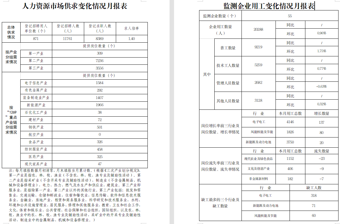 目前本市納入監測企業數量為55家,本月企業用工數量為20288人,環比上升0.96%。所監測的企業崗位增長率前三行業依次是電子電工、風能核能及節能和新能源及動力電池。崗位流失人數前三行業依次是現代農業及綠色食品、文化及創意產業、非金屬新材料,流失數量分別是23人、9人、7人。55家企業目前缺工數為636個,企業崗位缺工最多的三個行業依次是電子電工、新能源及動力電池、風能核能及節能,缺工人數分別為318人、71人、60人,電子電工等作為我市重要的支柱產業,用工需求仍然較大。