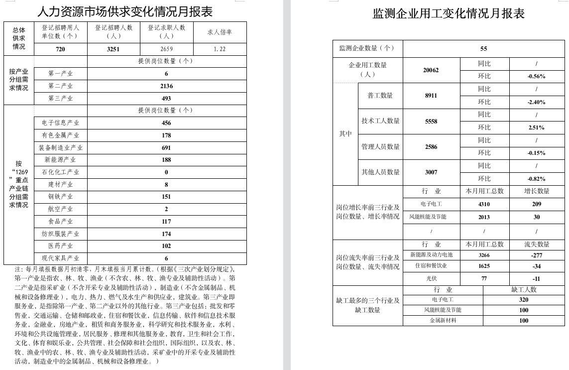 目前本市納入監測企業數量為55家,本月企業用工數量為20062人,環比下降0.56%。所監測的企業崗位增長率前二行業依次是電子電工、風能核能及節能。崗位流失人數前三行業依次是新能源及動力電池、住宿和餐飲業和光伏,流失數量分別是277人、34人、11人。55家企業目前缺工數為689個,企業崗位缺工最多的三個行業依次是電子電工、風能核能及節能、金屬新材料,缺工人數分別為320人、100人、100人,電子電工等作為我市重要的支柱產業,用工需求仍然較大。普工人數環比減少,技術工人環比增加的主要原因是用工人數增長行業主要為電子電工,其中用工人數增長為技術工人數量;用工人數減少的行業主要為機械制造和化工纖維,其中主要減少為普工人數(普工人員流失主要是勞動者解除勞動合同、勞動合同終止、用人單位和勞動者雙方協商解除勞動合同的情況)