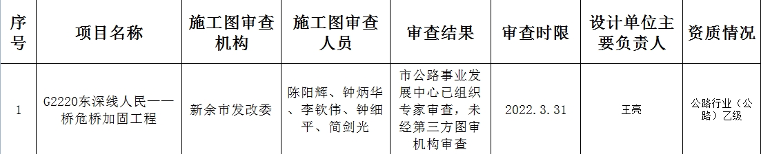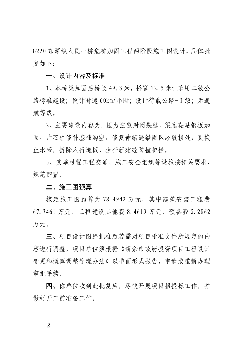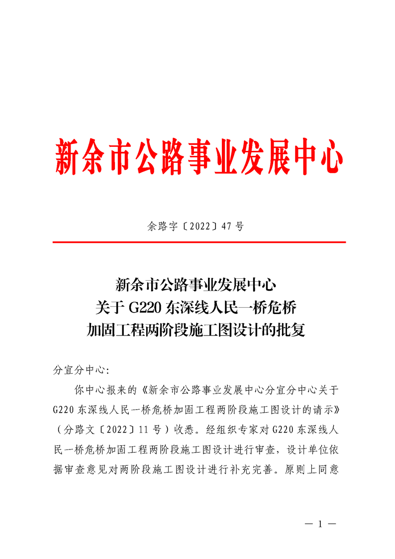 新余市公路事業發展中心關于G220東深線人民一橋危橋加固工程兩階段施工圖設計的批復