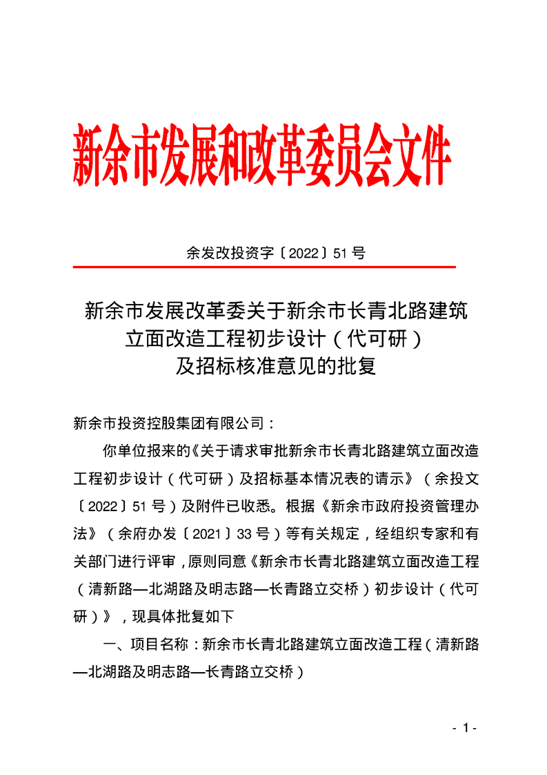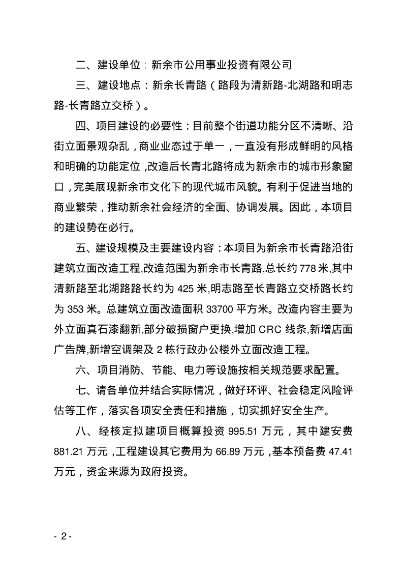 新余市發(fā)展改革委關(guān)于新余市長青北路建筑立面改造工程初步設(shè)計(jì)(代可研)及招標(biāo)核準(zhǔn)意見的批復(fù)