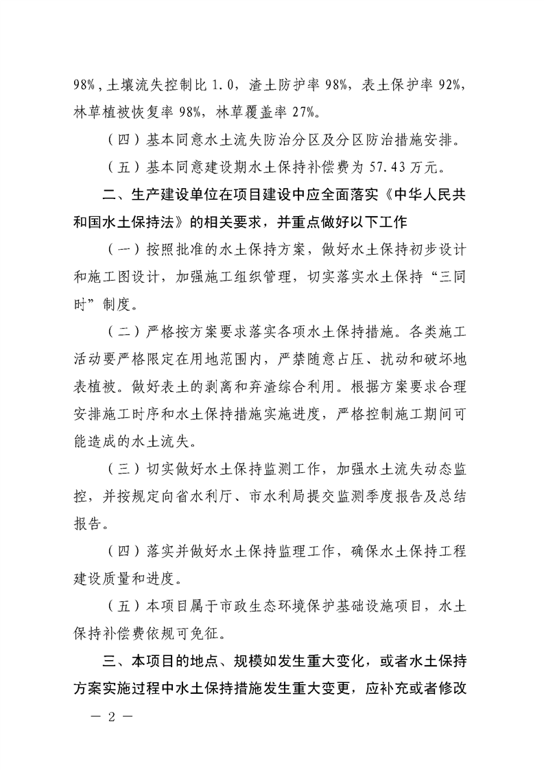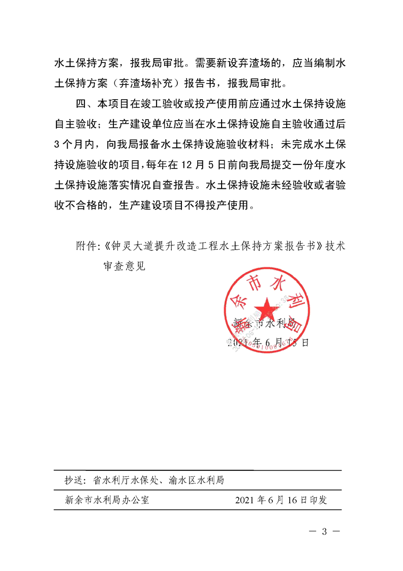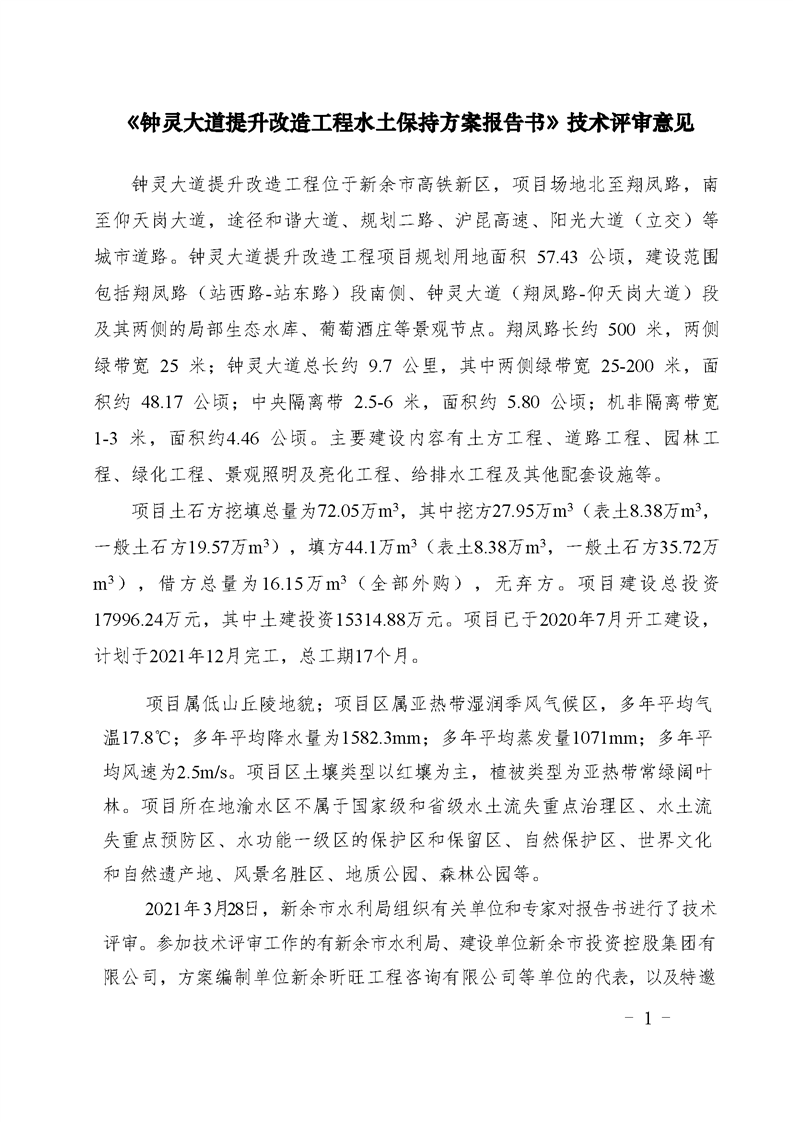 新余市水利局關于《鐘靈大道提升改造工程水土保持方案報告書》審批意見的函