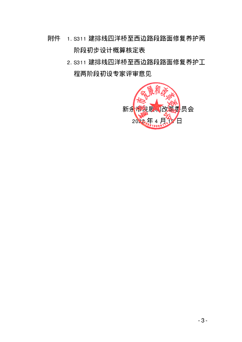 新余市發展和改革委員會關于S311建排線四洋橋至西邊路段路面修復養護工程兩階段初步設計的批復