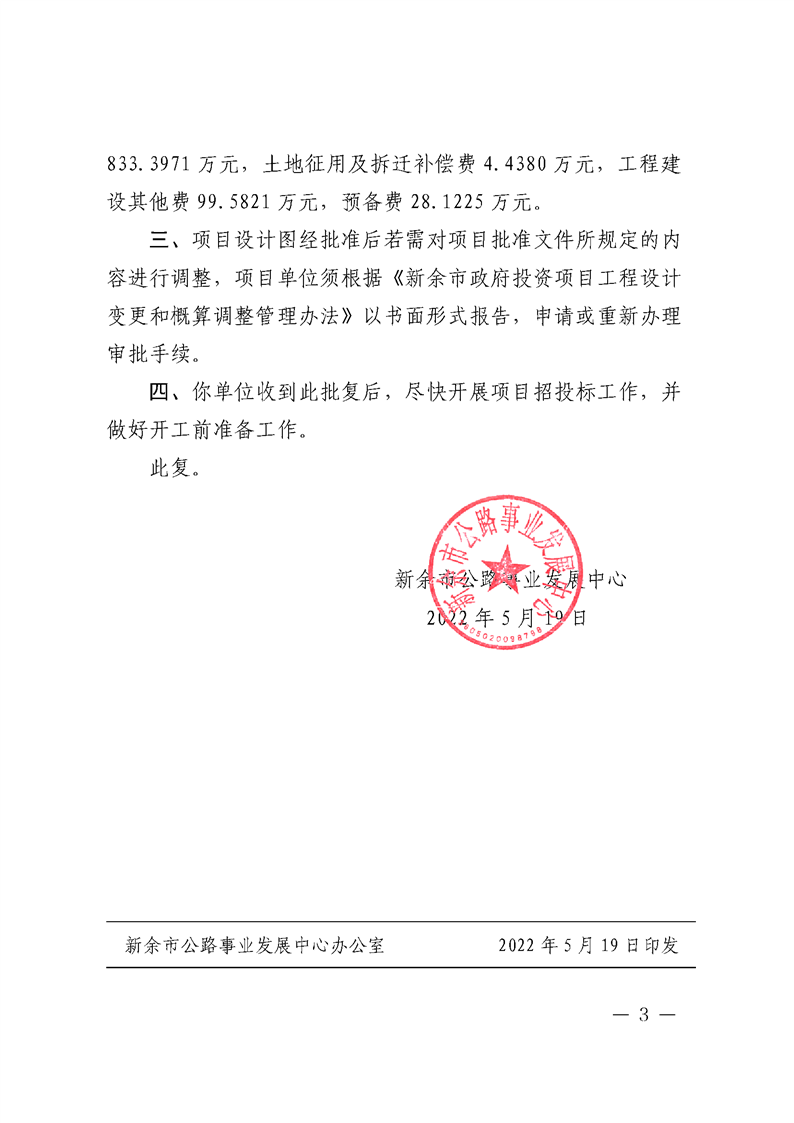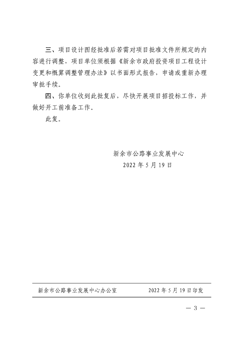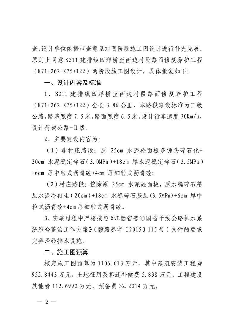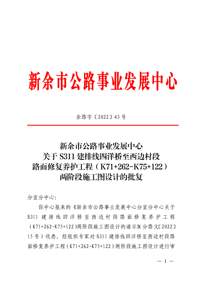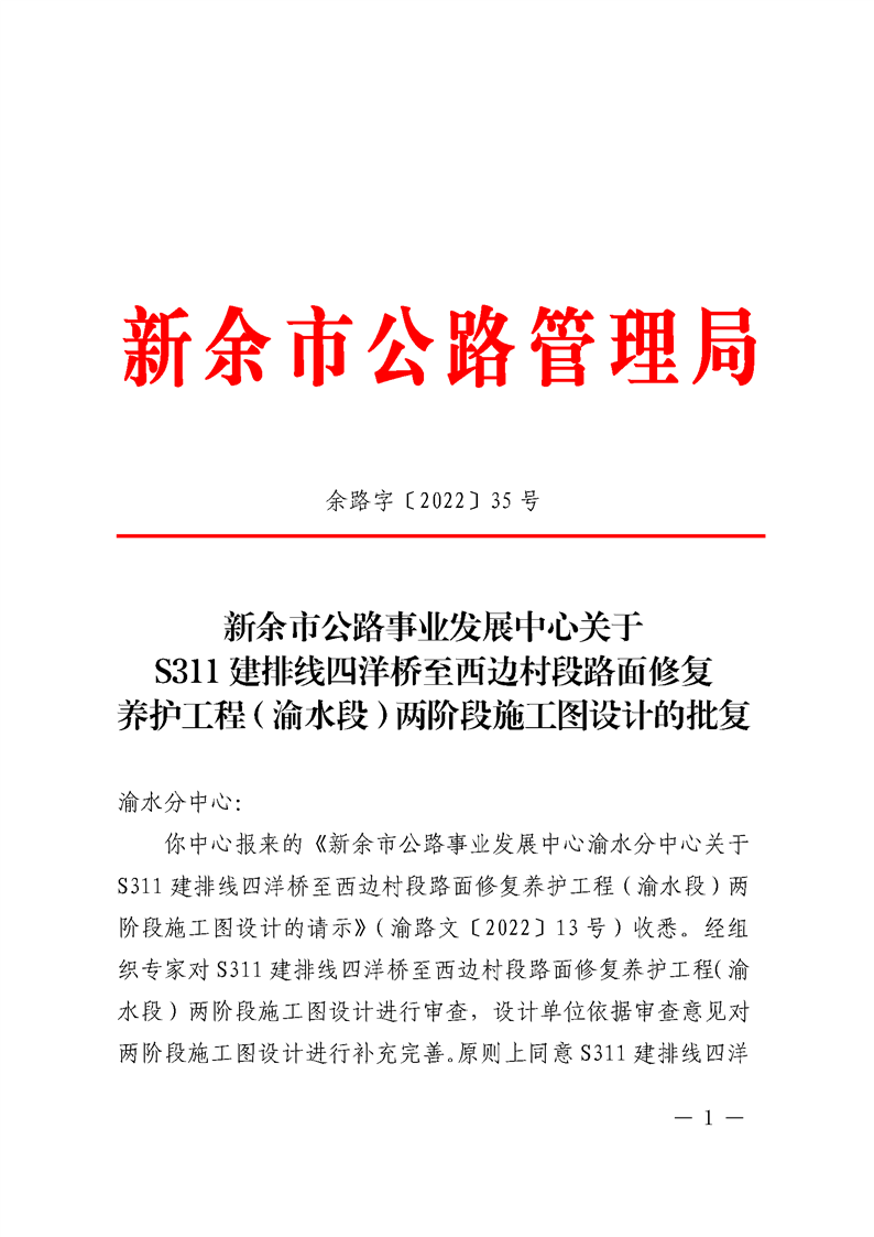 新余市公路事業發展中心關于S311建排線四洋橋至西邊村段路面修復養護工程(渝水段)兩階段施工圖設計的批復