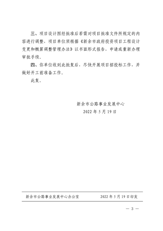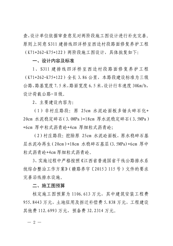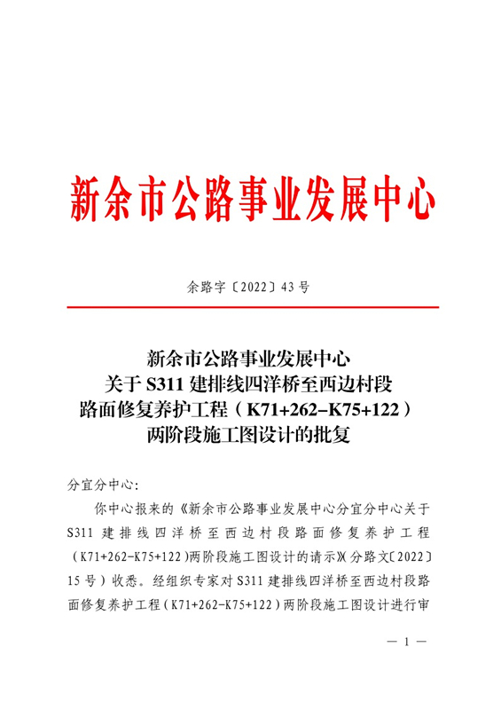 新余市公路事業發展中心關于S311建排線四洋橋至西邊村段路面修復養護工程(K71+262-K75+122)兩階段施工圖設計的批復