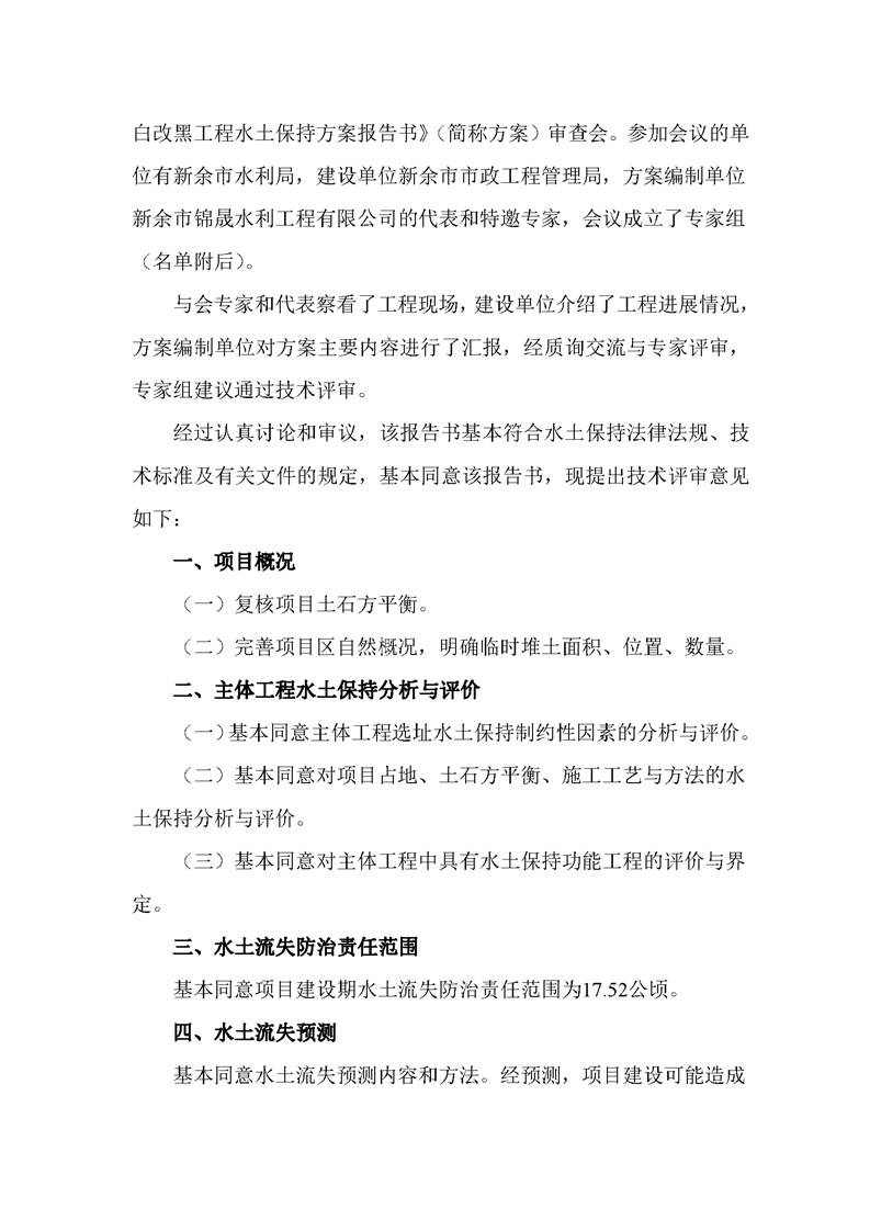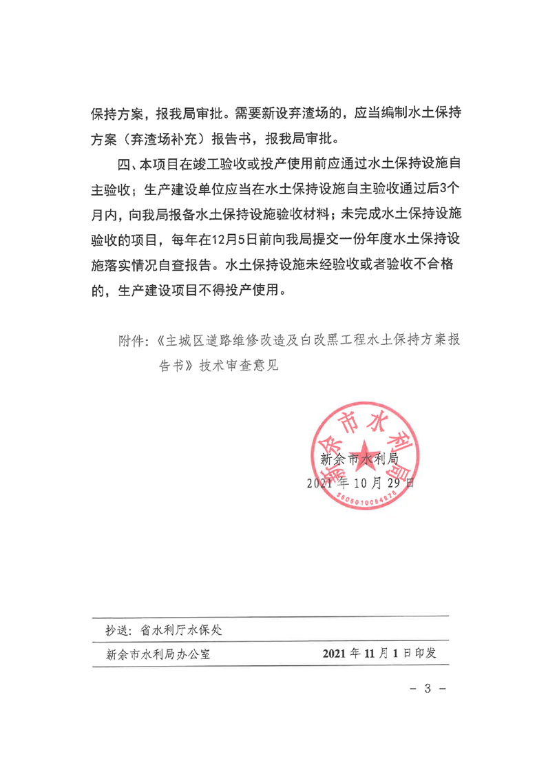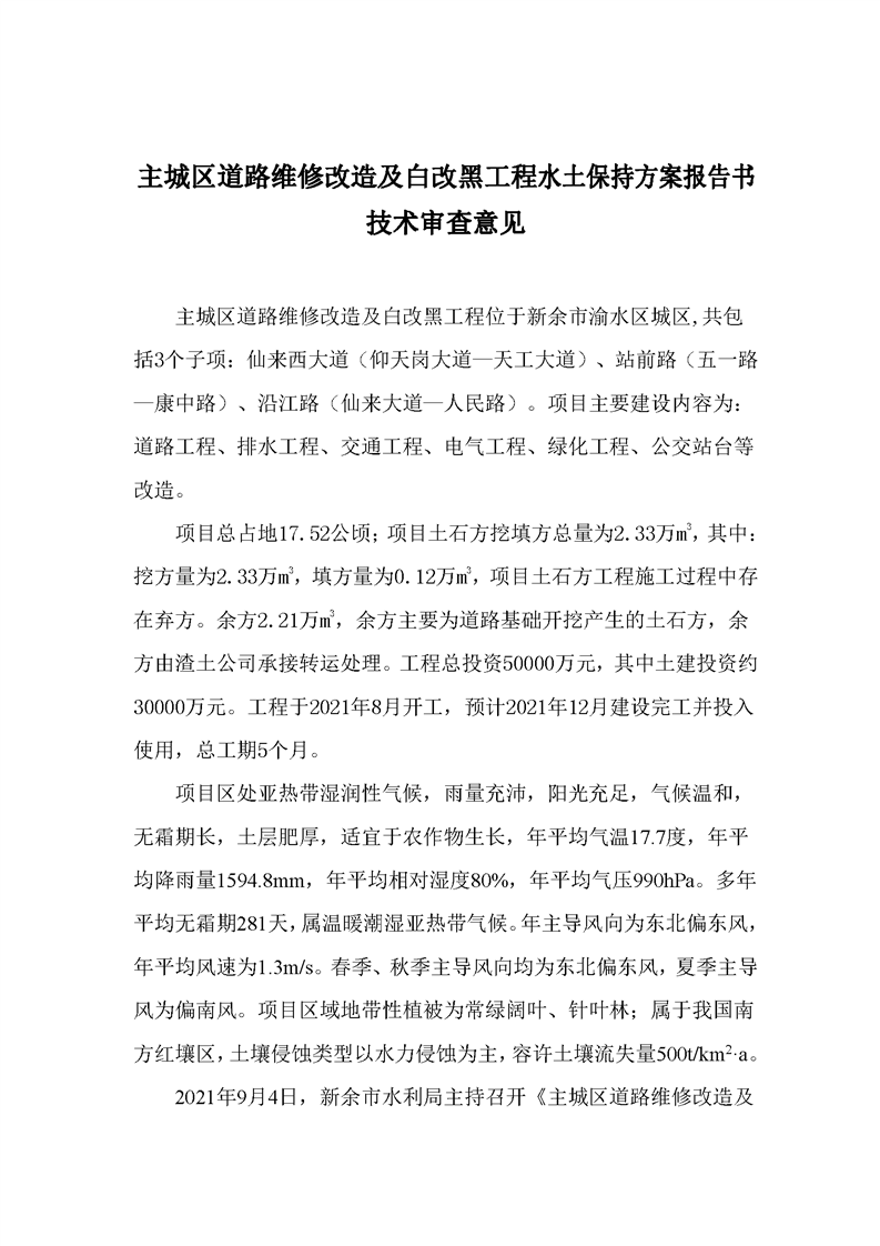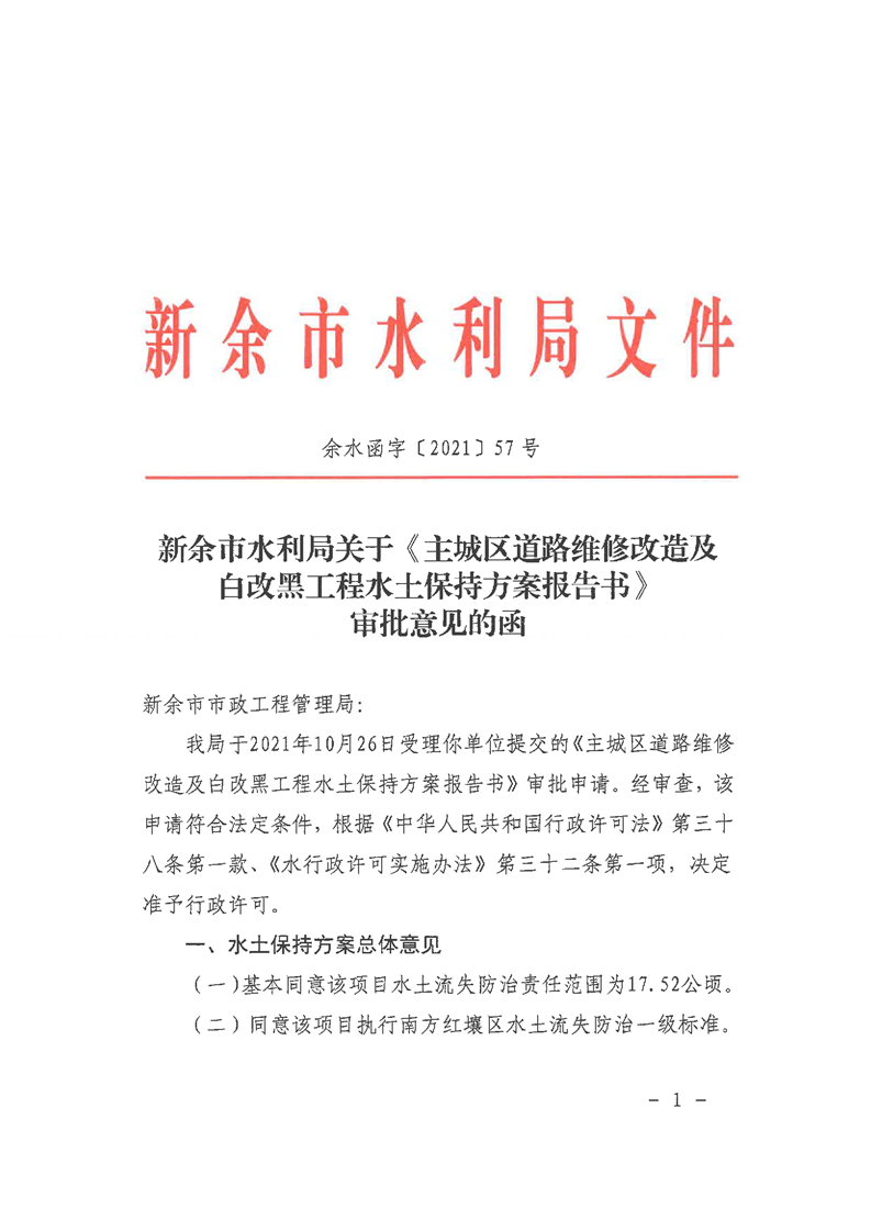 新余市水利局關(guān)于《主城區(qū)道路維修改造及白改黑工程水土保持方案報(bào)告書》審批意見的函