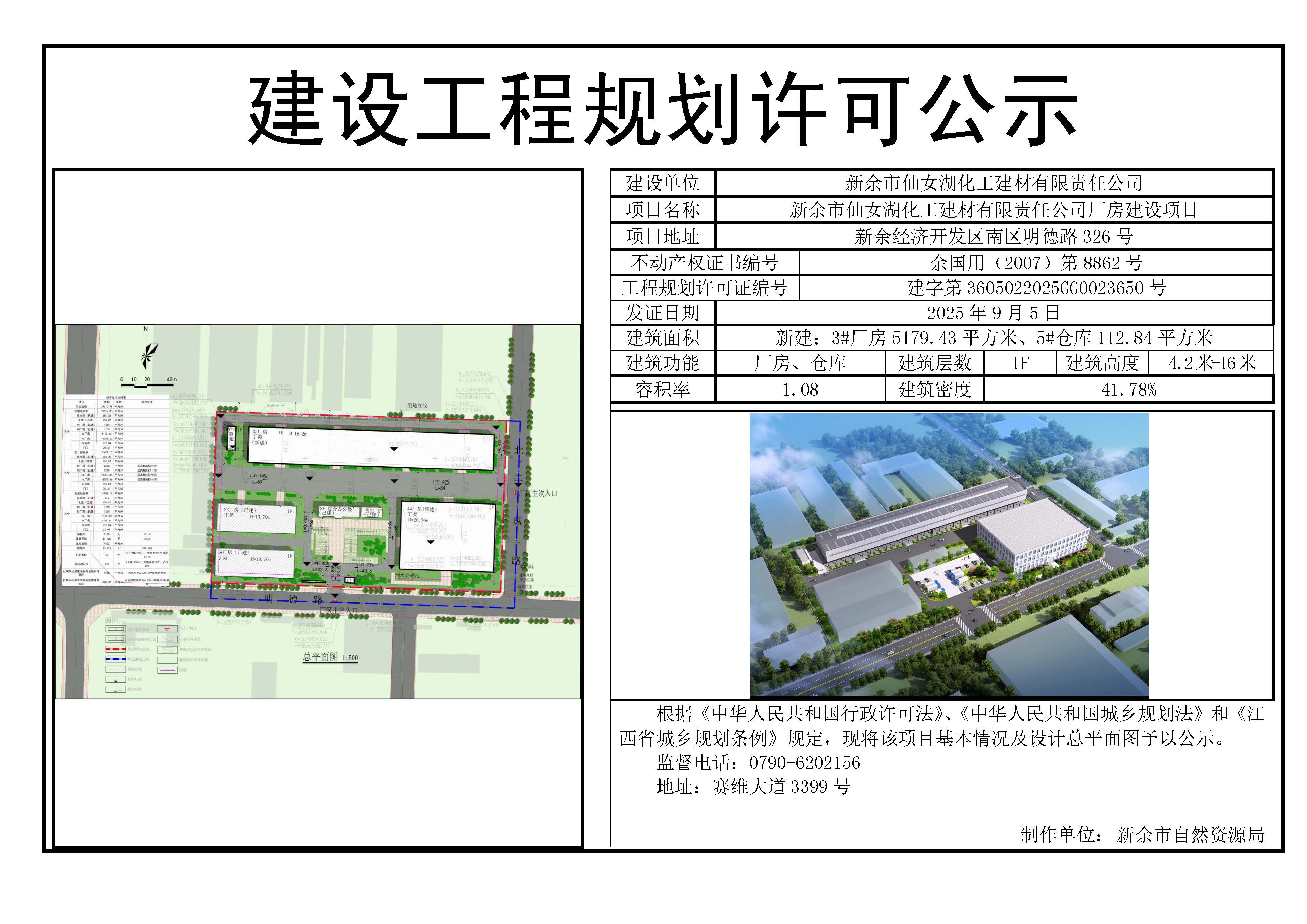 新余市仙女湖化工建材有限責任公司廠房建設項目建設規劃已經批準。根據《中華人民共和國行政許可法》、《中華人民共和國城鄉規劃法》和《江西省城鄉規劃條例》規定,現將該建設項目基本情況及設計總平面圖予以公示。