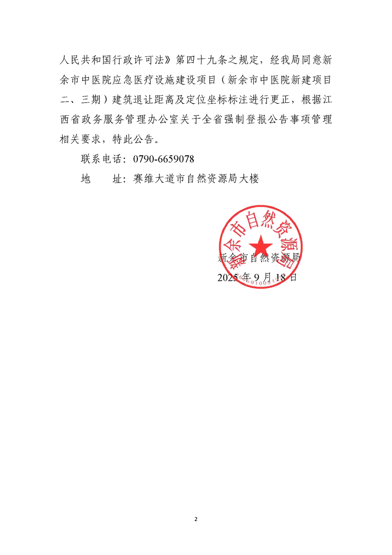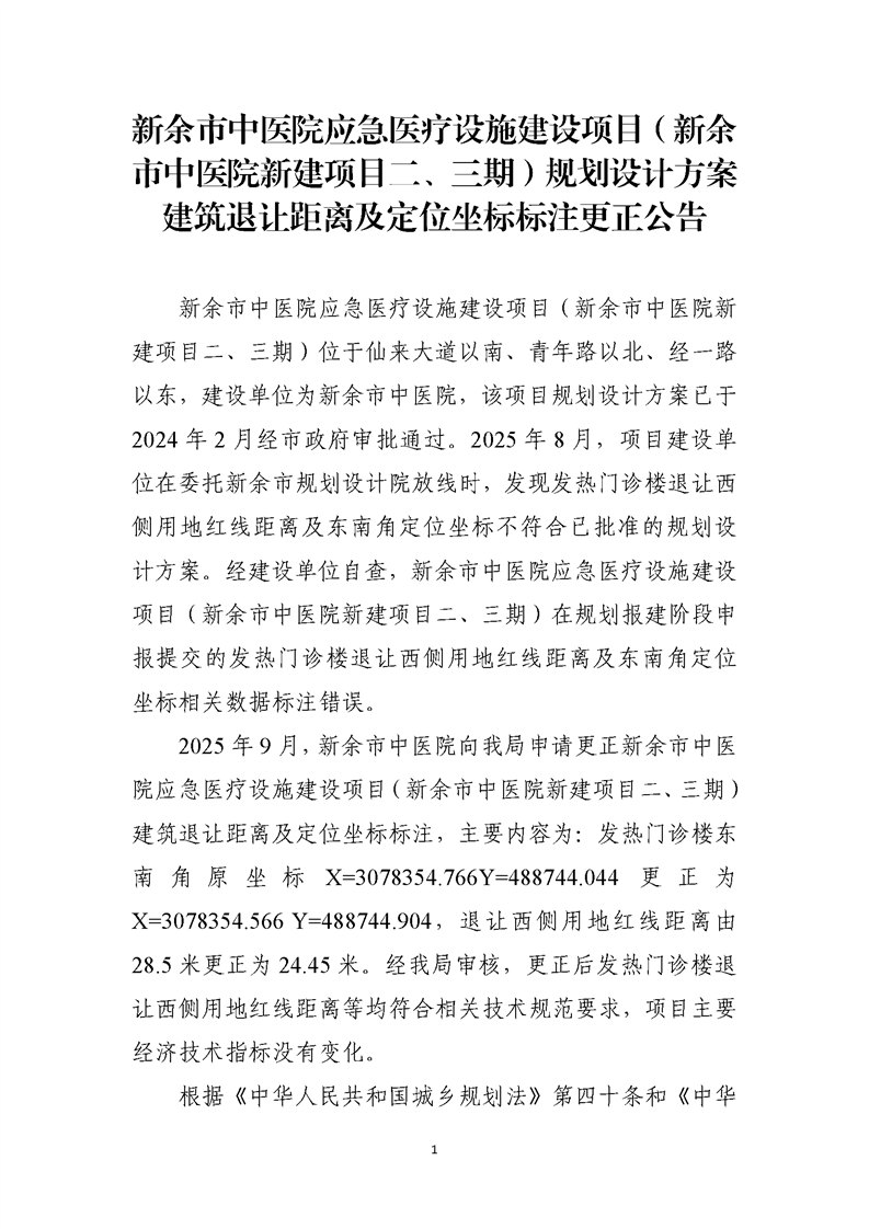 新余市中醫院應急醫療設施建設項目(新余市中醫院新建項目二、三期)規劃設計方案建筑退讓距離及定位坐標標注更正公告