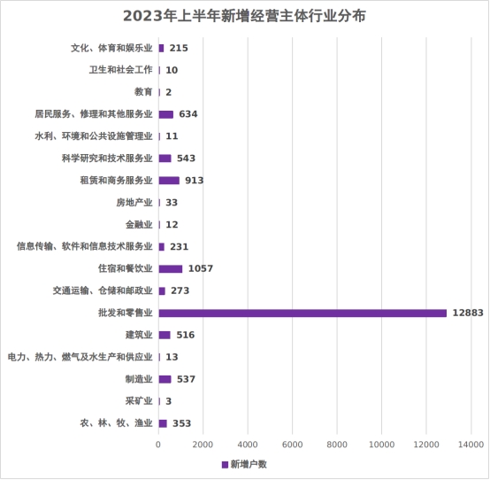 從新增經營主體行業分布情況看,批發零售業數量仍居首位,該行業新增經營主體12883戶,占新增總戶數的70.33%;第二位是住宿和餐飲業,該行業新增經營主體1057戶,占總戶數的5.77%;第三位租賃和商務服務業,該行業新增經營主體913戶,占總戶數的4.98%。這表明,隨著經營消費需求的持續釋放,我市接觸型聚集型行業回升明顯,保持較快增長。