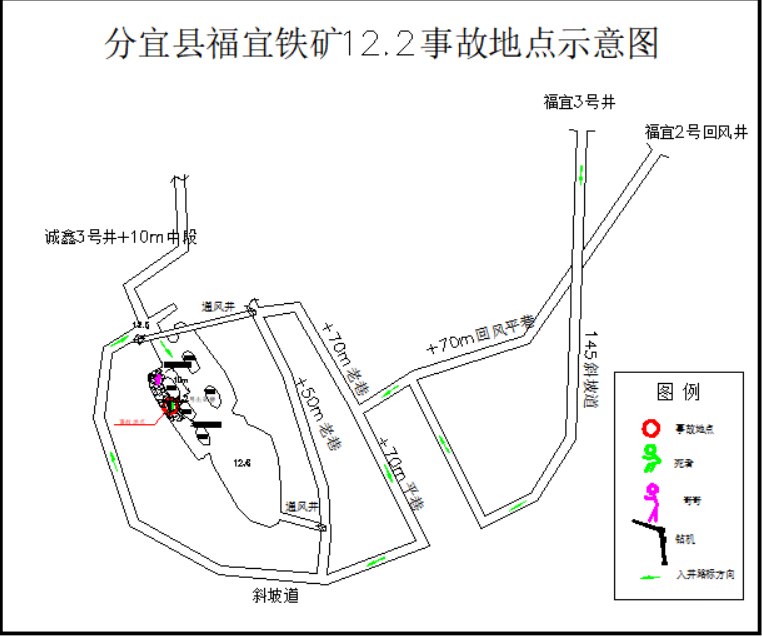 2.開采及基建情況。事故前建設(shè)工作面有福宜+90m中段南翼回風(fēng)天井、福宜+90m中段北翼補外脈巷、福宜+50m中段南翼石門通風(fēng)天井、福宜+50m中段運輸巷四個工作面,原福宜鐵礦3號井+10m中段(標(biāo)高+12.5m)2#出礦巷(擅自啟封違法組織采礦生產(chǎn))。