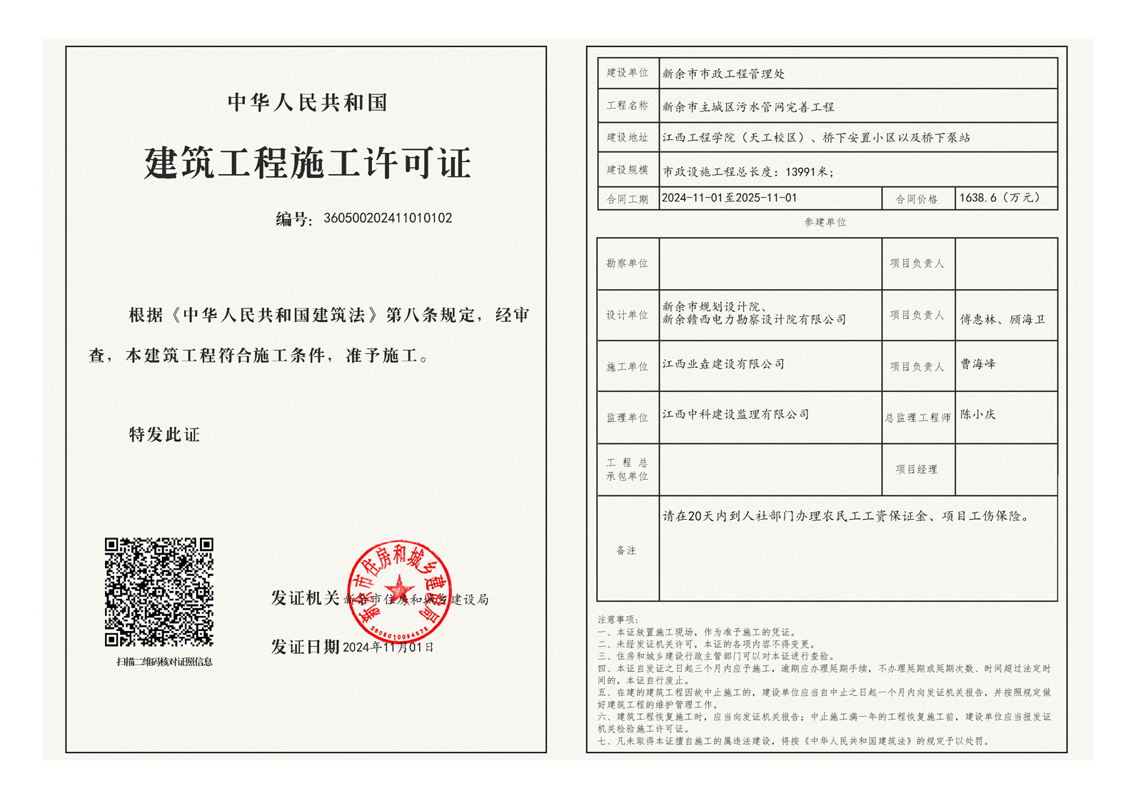 新余市主城區污水管網完善工程-建筑工程施工許可證
