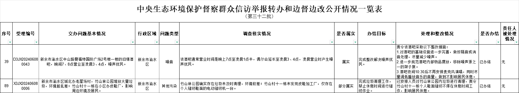 截至6月18日,對中央第三生態環境保護督察組向新余市移交的第三十二批群眾信訪舉報件2件,責任單位均按要求上報調查處理情況。根據督察要求,群眾信訪舉報轉辦和邊督邊改公開情況一覽表將在報紙、網站等媒體上公布。