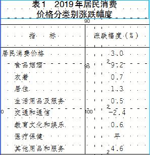 全年居民消費價格(CPI)比上年上漲3.0%。其中,服務價格上漲0.9%,消費品價格上漲4.2%,非食品價格上漲0.6%,扣除鮮菜鮮果價格上漲2.4%。構成CPI的八大類商品服務價格“六漲一平一降”。食品和煙酒類上漲9.2%,其他用品和服務類上漲4.6%,居住類上漲1.3%,衣著類上漲0.7%,教育文化和娛樂類上漲0.6%,生活用品及服務類上漲0.5%,醫療保健類與上年持平,交通和通信類下降2.4%。商品零售價格總指數上漲2.3%。