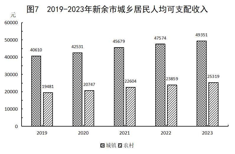 全年全市城鎮居民人均可支配收入49351元,比上年增長3.7%;農村居民人均可支配收入25319元,增長6.1%。城鎮居民人均消費支出30646元,增長6.6%;農村居民人均消費支出20544元,增長7.8%。