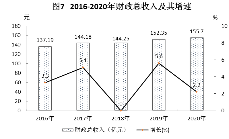 全年財政總收入155.7億元,比上年增長2.2%。其中,一般公共預算收入80.34億元,增長3.1%。稅收總收入139.2億元,下降0.1%,占財政總收入的比重為89.4%,比上年回落2.0個百分點。在主體稅種中,增值稅78.26億元,增長2.9%;企業(yè)所得稅27.54億元,下降16.3%;個人所得稅13.96億元,增長16.6%。全年一般公共預算支出164.61億元,增長4.1%。其中,一般公共服務支出13.44億元,增長6.4%;節(jié)能環(huán)保支出3.57億元,增長88.5%;災害防治及應急管理支出1.6億元,增長35.7%;衛(wèi)生健康支出14.7億元,增長12.4%;科學技術支出3.14億元,增長10.8%;教育支出25.7億元,增長8.8%。