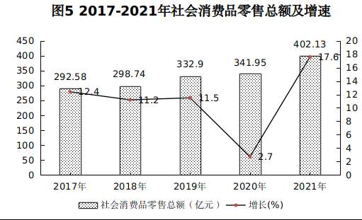 全年全市社會消費(fèi)品零售總額402.13億元,比上年增長17.6%。按城鄉(xiāng)分,城鎮(zhèn)消費(fèi)品零售額352.21億元,增長17.5%;鄉(xiāng)村消費(fèi)品零售額49.92億元,增長18.6%。按消費(fèi)類型分,餐飲收入34.68億元,增長34.6%;商品零售367.45億元,增長16.2%。
