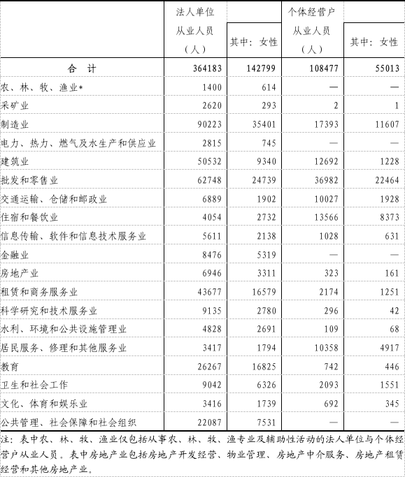 2023年末,全市第二產業和第三產業法人單位從業人員364183人,比2018年末減少10917人,下降2.9%,其中女性從業人員142799人。第二產業從業人員145500人,減少14404人,下降9.0%;第三產業從業人員218683人,增加3201人,增長1.5%。個體經營戶從業人員108477人,其中女性從業人員55013人。