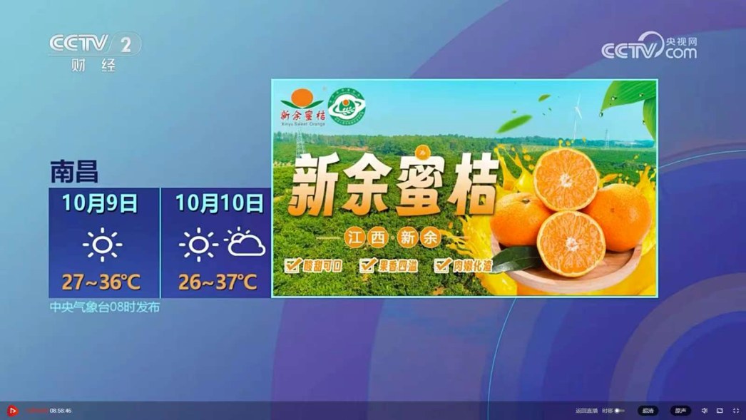 10月9日,中央廣播電視總臺財經頻道(CCTV-2)《第一時間》城市氣象預報欄目對新余蜜桔進行專題展示,節目時長約53秒。為進一步提升新余蜜桔品牌知名度和市場影響力,繼2024年在中央廣播電視總臺財經頻道(CCTV-2)《第一時間》城市氣象預報欄目成功宣傳后,今年,我市再次與該欄目合作,宣傳推廣新余蜜桔,宣傳周期為2個月。