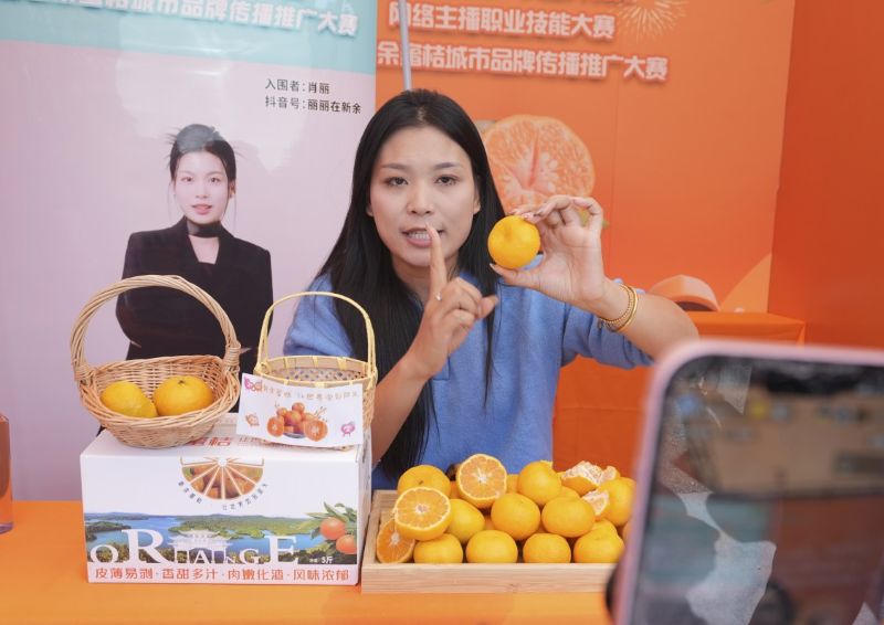 10月24日,2025網(wǎng)絡(luò)主播技能大賽上,參賽者通過直播銷售新余蜜桔。我市舉辦網(wǎng)絡(luò)主播技能賽,通過眾多帶貨主播、大學(xué)生、新農(nóng)人等利用直播形式推介、銷售新余蜜桔,助力當(dāng)?shù)卮蛟燹r(nóng)產(chǎn)品品牌和果農(nóng)增收。