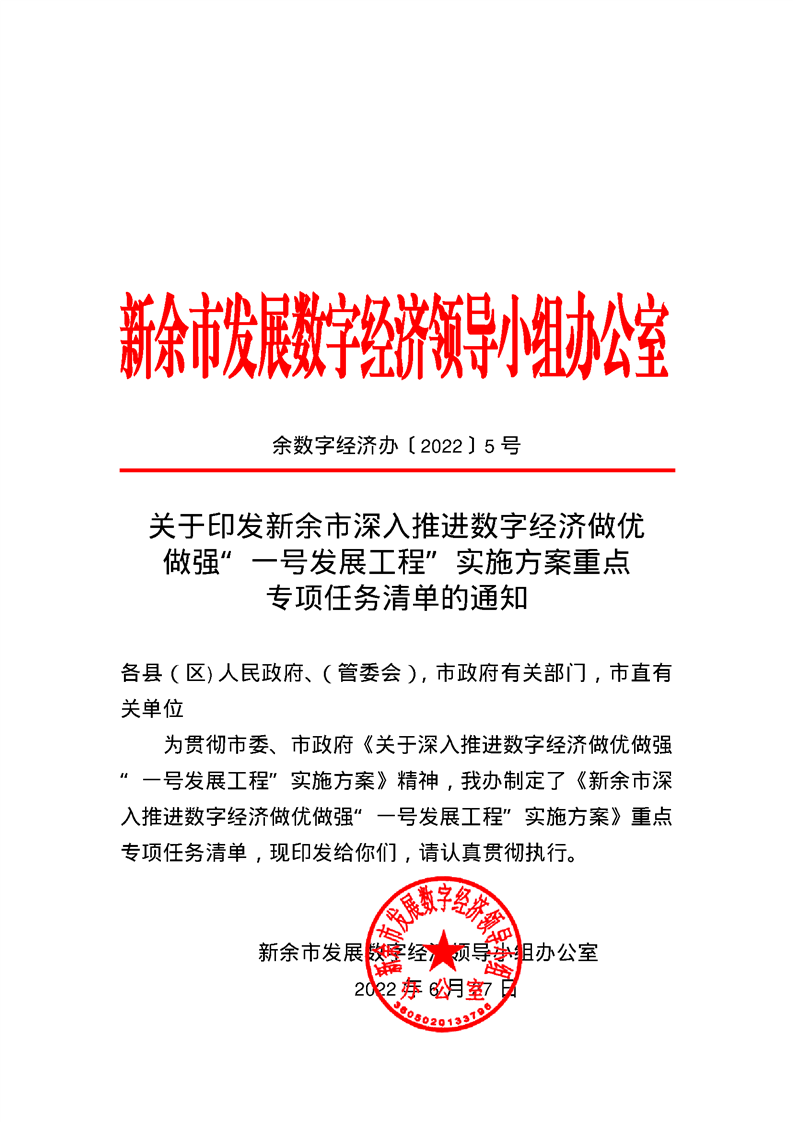 關于印發新余市深入推進數字經濟做優做強“一號發展工程”實施方案重點專項任務清單的通知