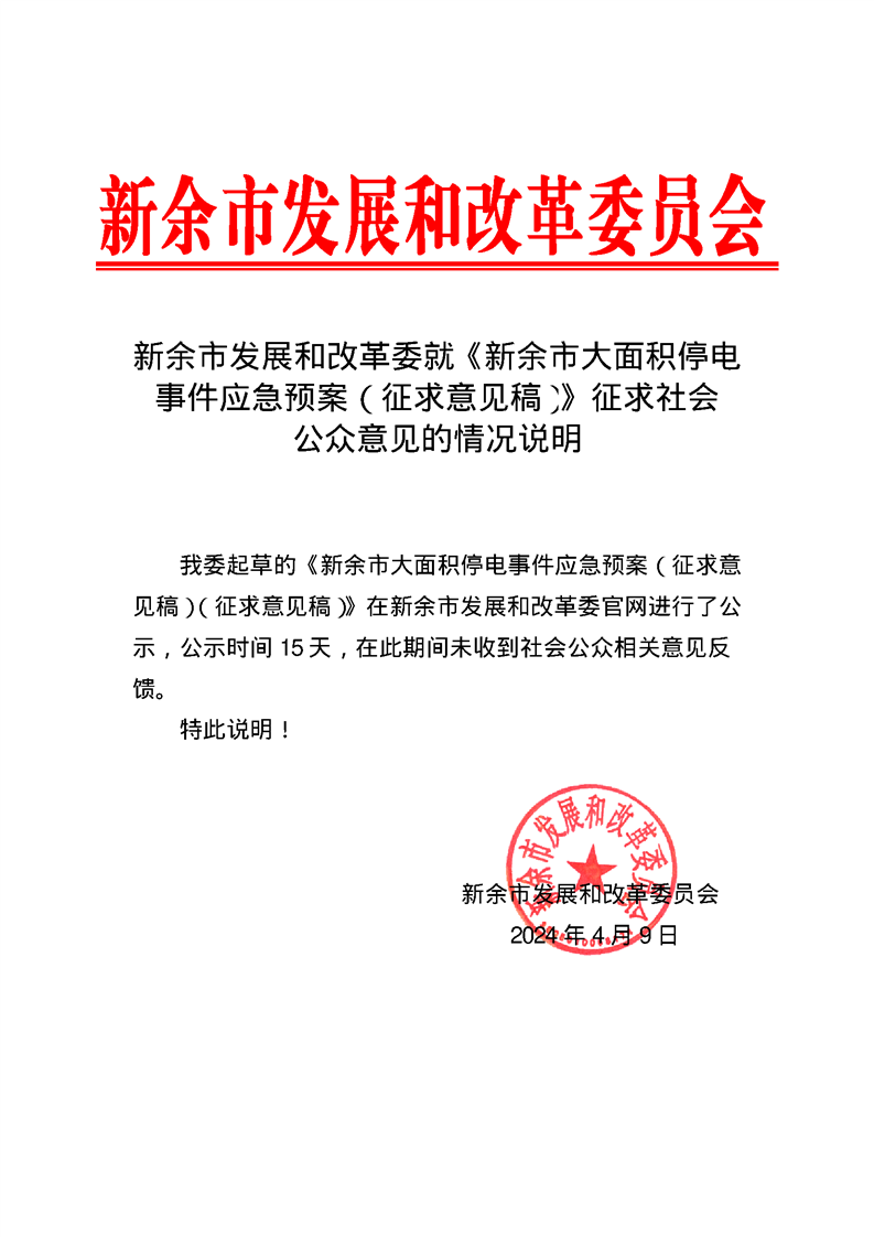 新余市發展和改革委就《新余市大面積停電事件應急預案(征求意見稿)》征求社會公眾意見的情況說明