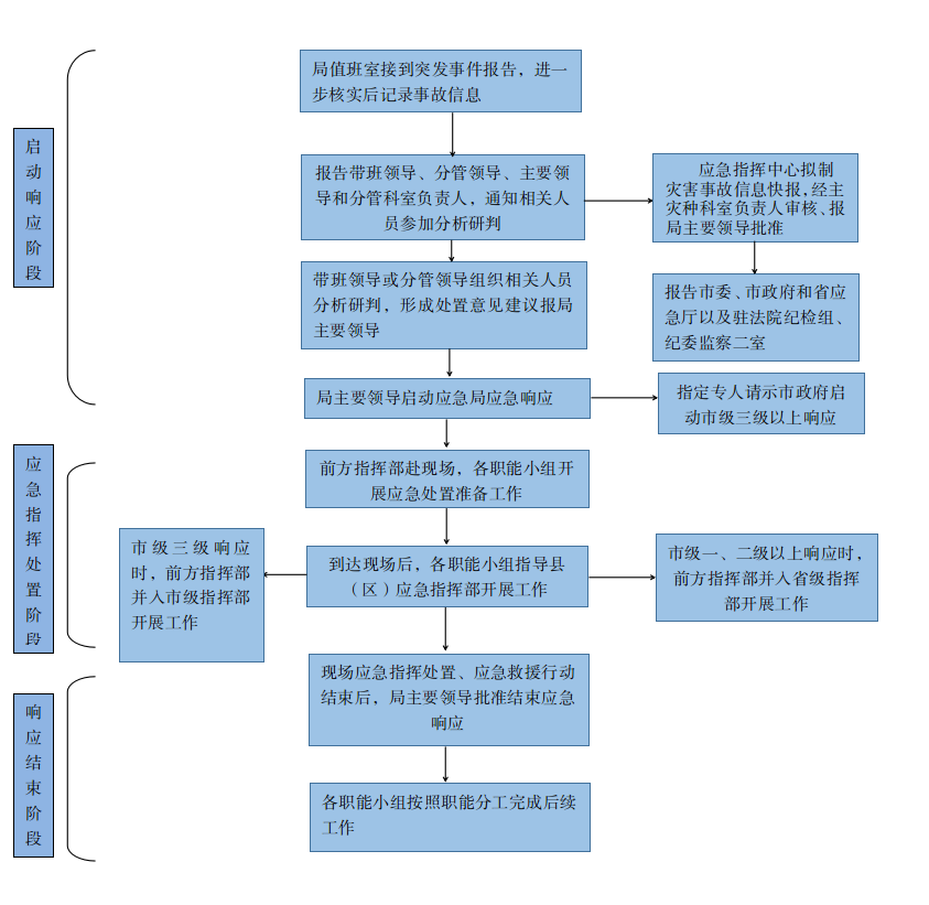 4.局主要領(lǐng)導(dǎo)綜合報(bào)告建議,啟動(dòng)市應(yīng)急局響應(yīng)。需啟動(dòng)市級(jí)三級(jí)以上響應(yīng)時(shí),指定專人向市政府請(qǐng)示報(bào)告。