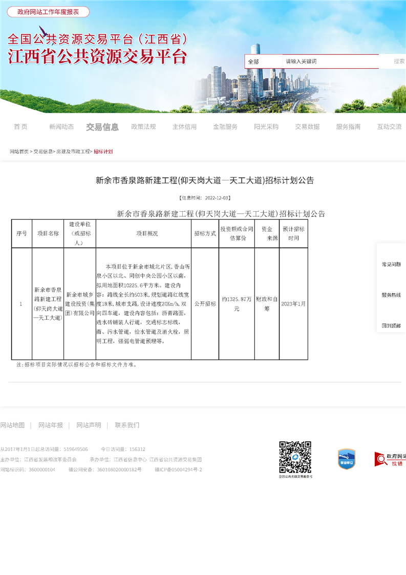 新余市香泉路新建工程(仰天崗大道—天工大道)招標計劃公告