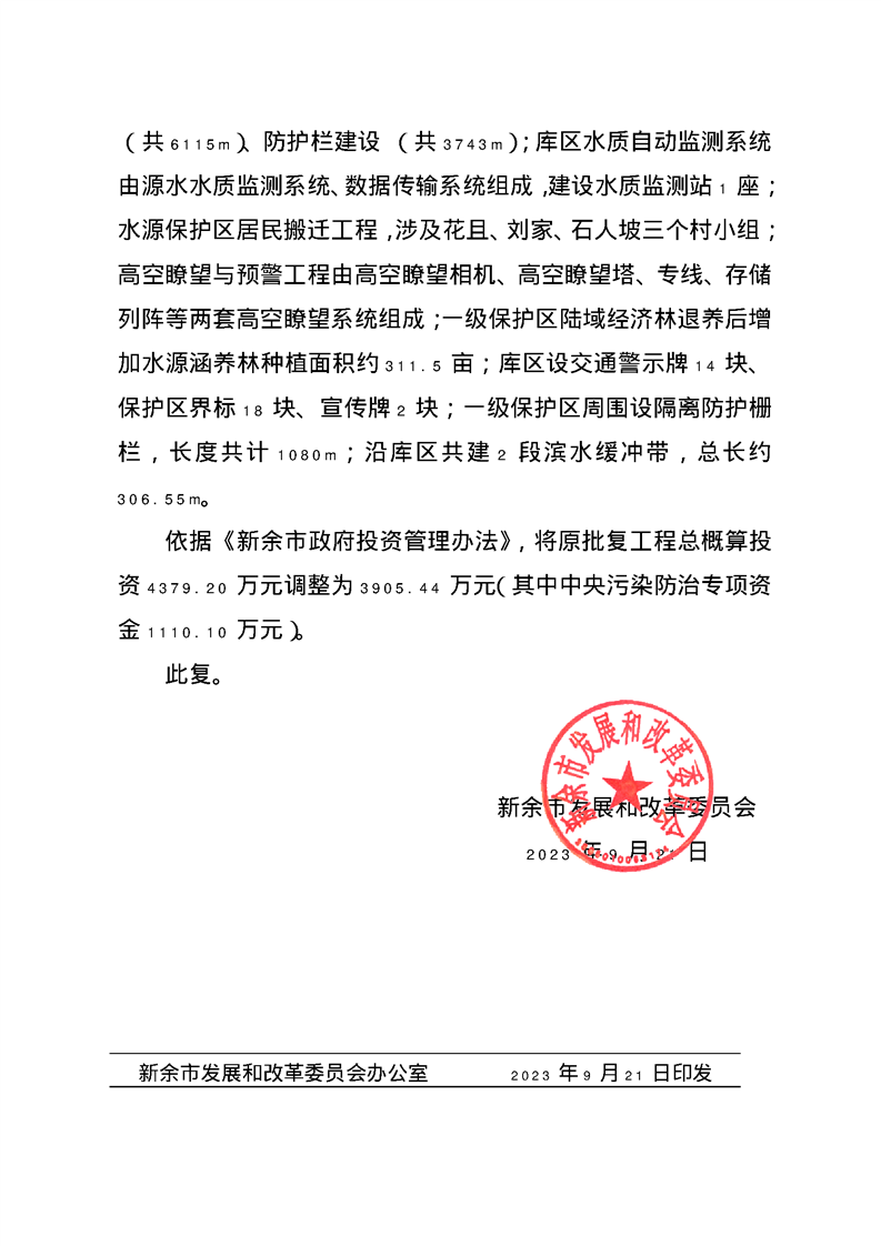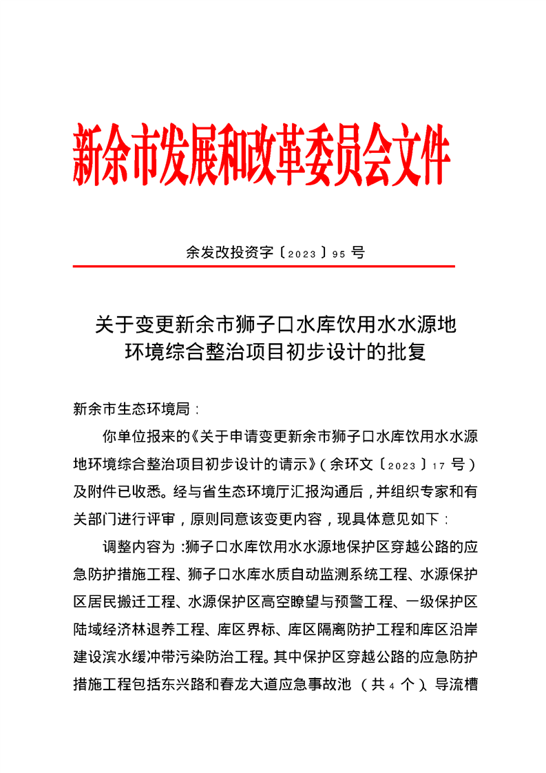 關(guān)于變更新余市獅子口水庫飲用水水源地環(huán)境綜合整治項目初步設(shè)計的批復(fù)