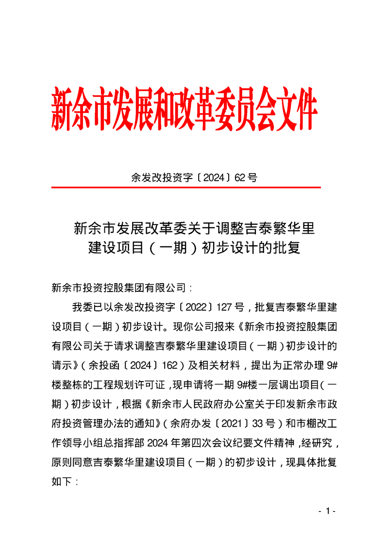 新余市發(fā)展改革委關(guān)于調(diào)整吉泰繁華里 建設(shè)項目(一期)初步設(shè)計的批復(fù)
