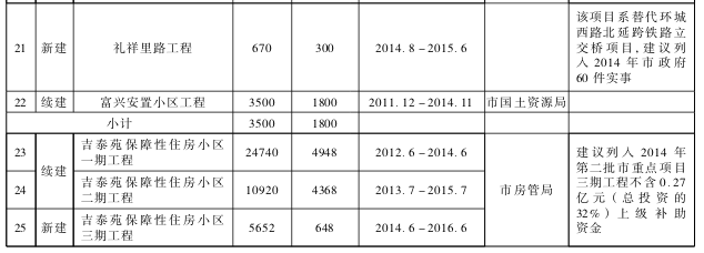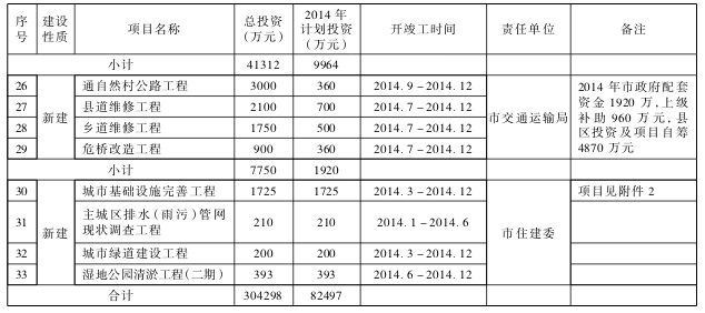 經市八屆人民政府第66次常務會議研究,確定2014年市本級政府投資城建交通建設項目計劃33個(具體項目附件1),計劃總投資30.43億元,2014年計劃完成投資8.25億元。其中:新建項目17個,計劃投資12.62億元,2014年計劃完成投資3.25億元;續建項目16個,計劃投資17.81億元,2014年計劃完成投資5億元。