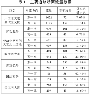 2.通過對繞城道路的主要交叉口進行調查,得到主要道路斷面流量數據,見表1。根據道路斷面流量數據調查表可以得到,新余市繞城道路以及周邊主要干道的交通組成中貨車占比較大。現狀繞城公路雖然保護了城市中心地區不受干擾,但是鑒于新鋼位于新余市的南面,距離市區較近,需要進行大量的貨物運輸等原因,導致貨運車輛通過繞城道路分布到了城市周邊的路段中,影響了城市外圍居民生活,破壞了周邊城市道路,擾亂了城市以小型車輛為主的通行秩序,嚴重降低了城市道路的使用壽命,增加了城市道路的養護頻率以及養護成本。