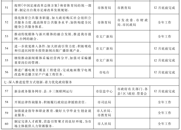 7強化新聞廣電監管與服務。推動傳統媒體與新興媒體的融合發展。制定允許社會資本以控股方式參與國有影視制作機構改制經營的辦法。進一步放寬準入條件,加大招商引資力度,積極吸收和引進民間資本投資新聞出版廣播影視產業。落實制作和出版分開實施辦法,在堅持播出權特許經營的前提條件下,對紀錄片、電視劇等影視作品實行制播分離。繼續推動新聞媒體采編經營兩分開,加強對采編播重要崗位的管理。推進廣播電視全覆蓋工程建設,完成地面數字電視改造和直播衛星戶戶通工程任務。(牽頭單位:市文廣新局)
