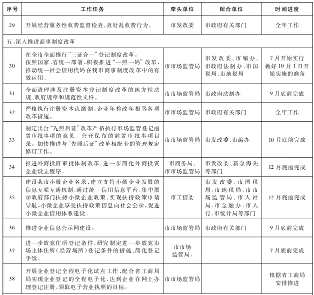 1實施“三證合一”登記制度改革。按照國務院和省政府關于加快推行“三證合一”登記制度改革有關文件要求,在全市全面推行“三證合一”登記制度。根據國家統一部署,積極推進“一照一碼”改革。推動統一社會信用代碼在我市商事制度改革中的有效運用。(牽頭單位:市市場監管局;配合單位:市發改委、市編辦、市政府法制辦、市國稅局、市地稅局)