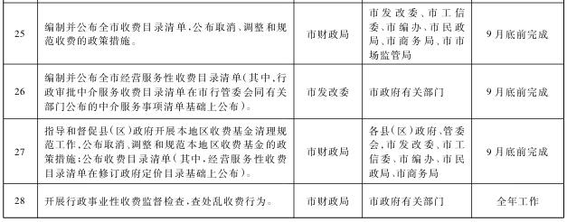 7編制并公布全市收費目錄清單。編制并公布全市經營服務性收費目錄清單。收費目錄清單之外的收費一律不得執行。(牽頭單位:市財政局、市發改委;配合單位:市政府有關部門,市直有關單位)