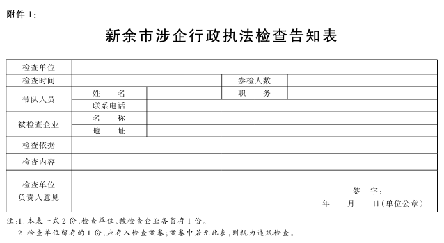 第五條開展涉企行政執法檢查的部門應填寫《新余市涉企行政執法檢查告知表》(見附件1),在檢查時將告知表送達被檢查企業。