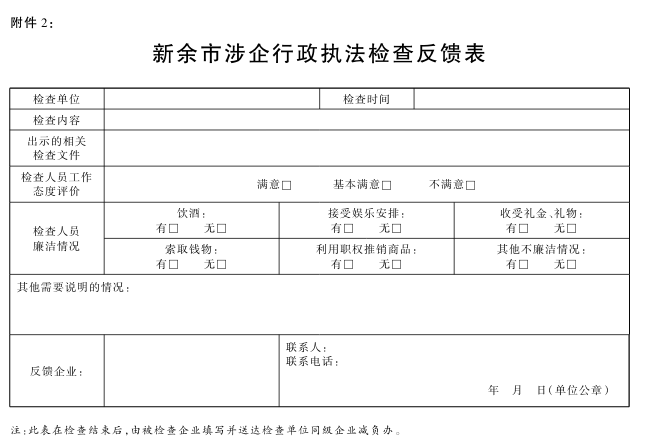 第八條建立涉企行政執法檢查反饋制度。各部門在進行涉企行政執法檢查時應向被檢查企業送達《新余市涉企檢查反饋表》(見附件2)。檢查完畢后,由被檢查企業將反饋表填寫并送達檢查單位同級企業減負辦公室。