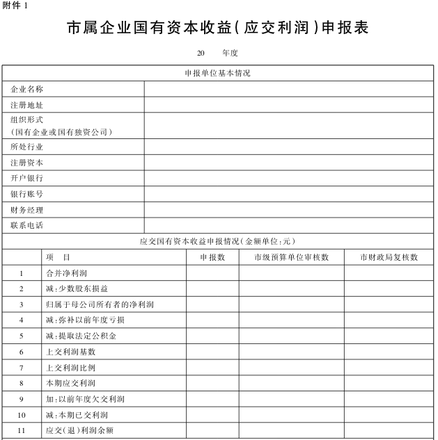 第六條企業上交國有資本收益應當按規定申報,并如實填寫市屬企業國有資本收益申報表(詳見附件1-4)。具體申報時間及要求如下:
